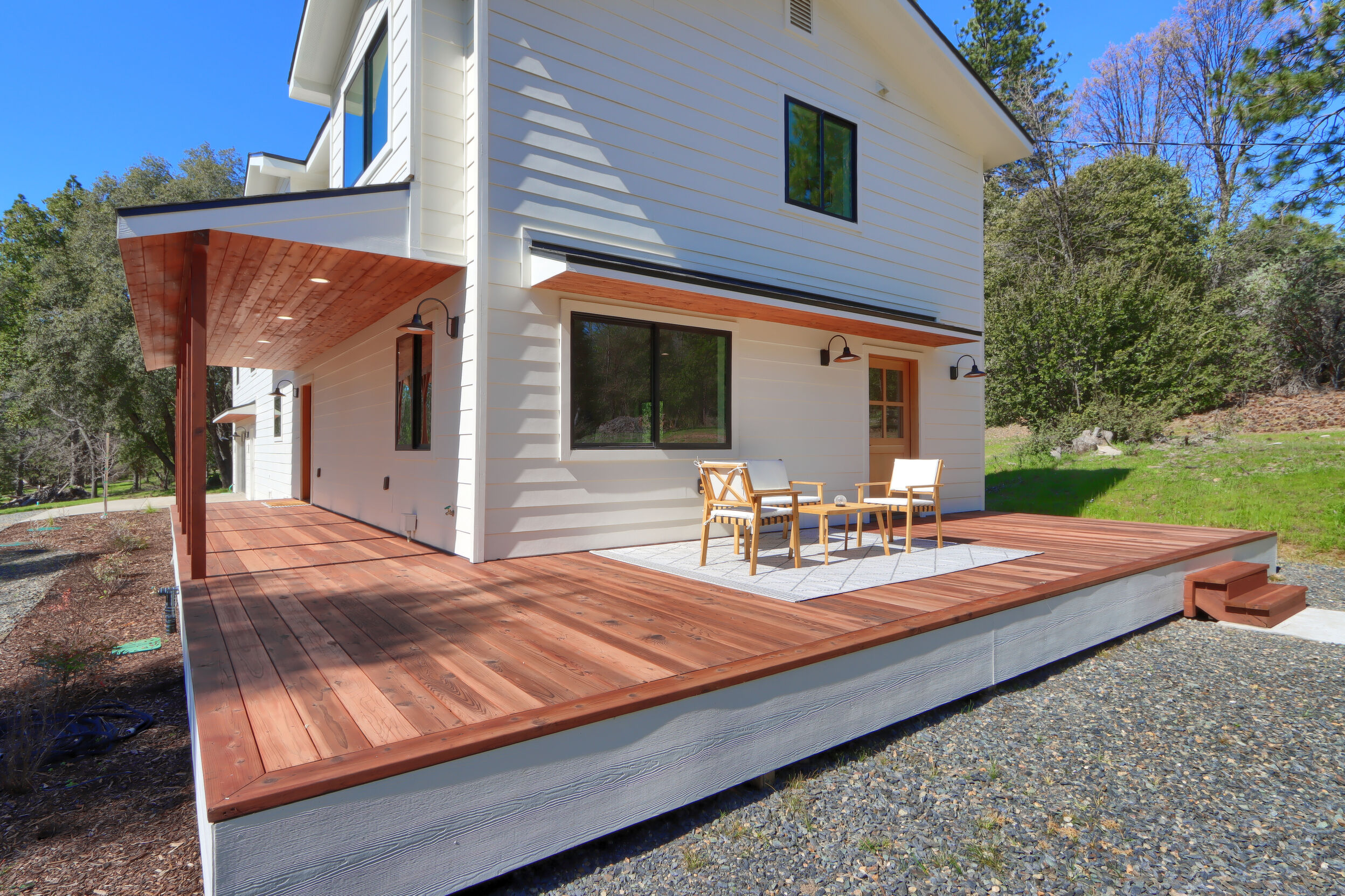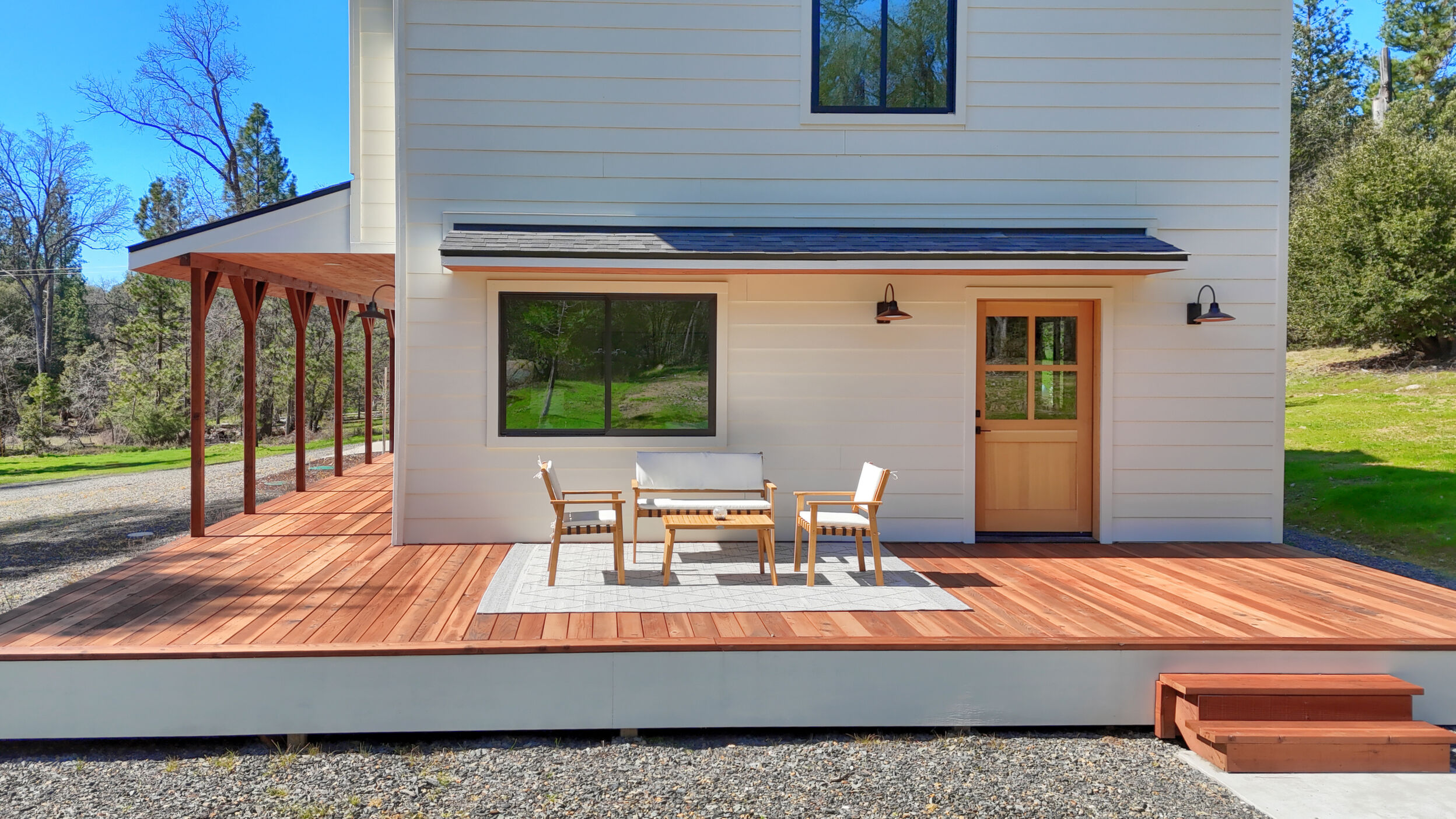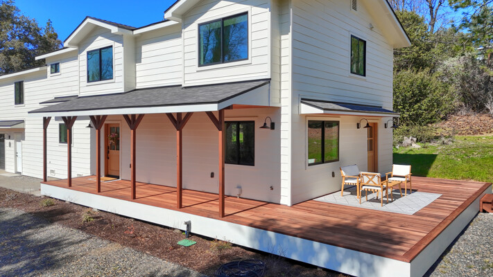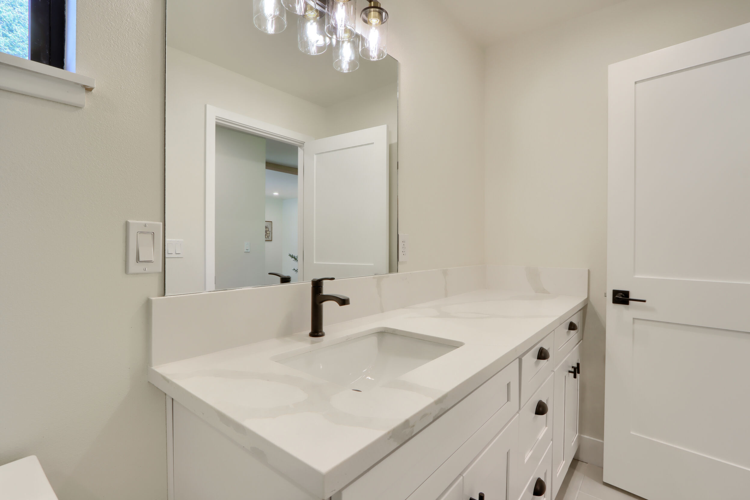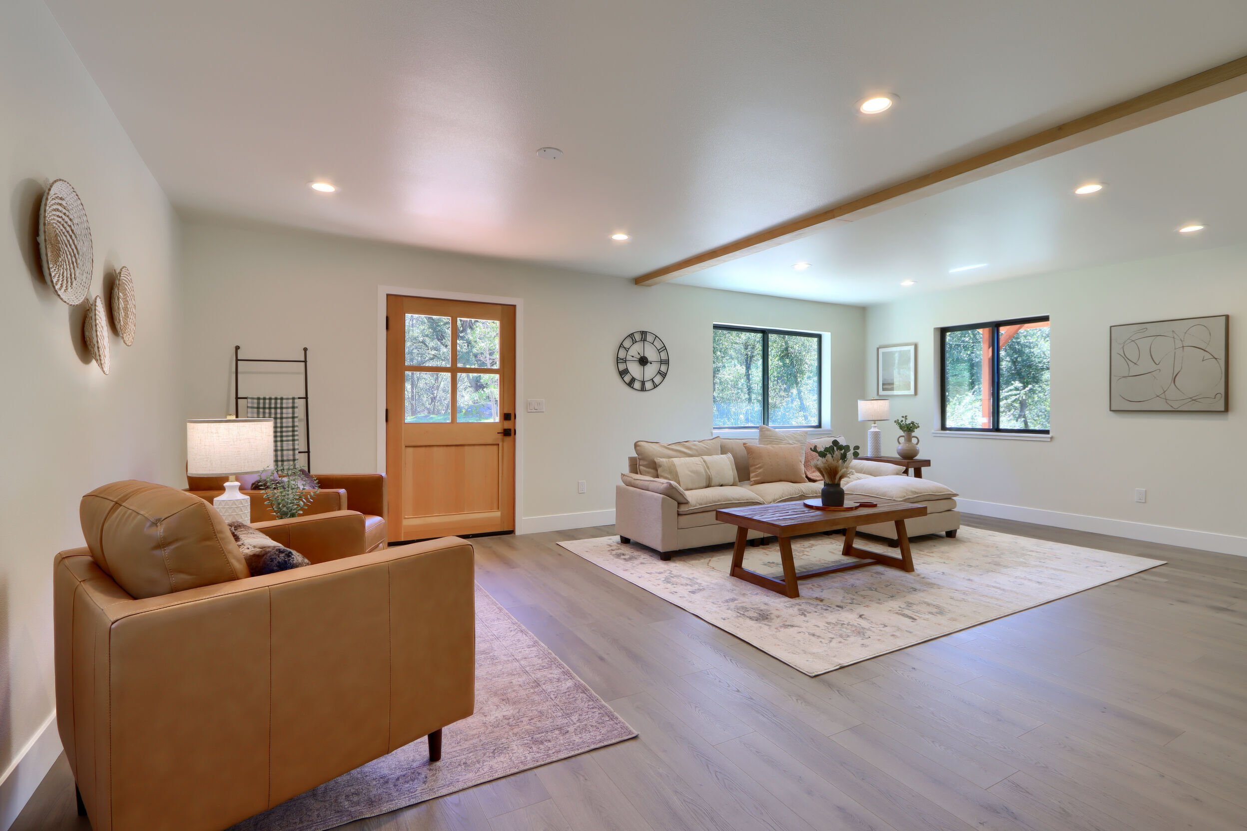 High-end finishes and craftsmanship shine throughout, including striking 42-inch wide solid walnut exterior doors, dual-pane high-end vinyl black-framed windows, durable concrete siding, beautiful redwood decking, premium flooring throughout, custom cabinetry, and quartz countertops across the home. All bathrooms feature beautiful tile surrounds, and ample lighting has been thoughtfully incorporated with recessed can lighting and fan/light combinations.