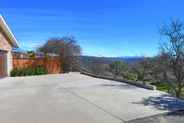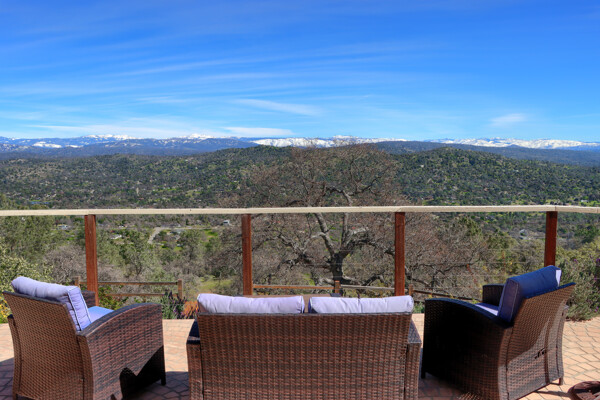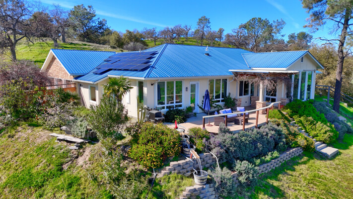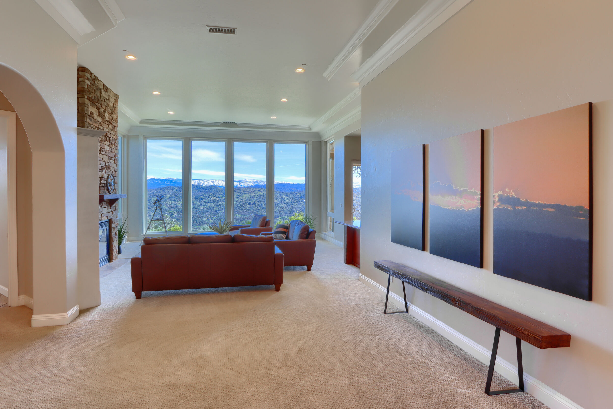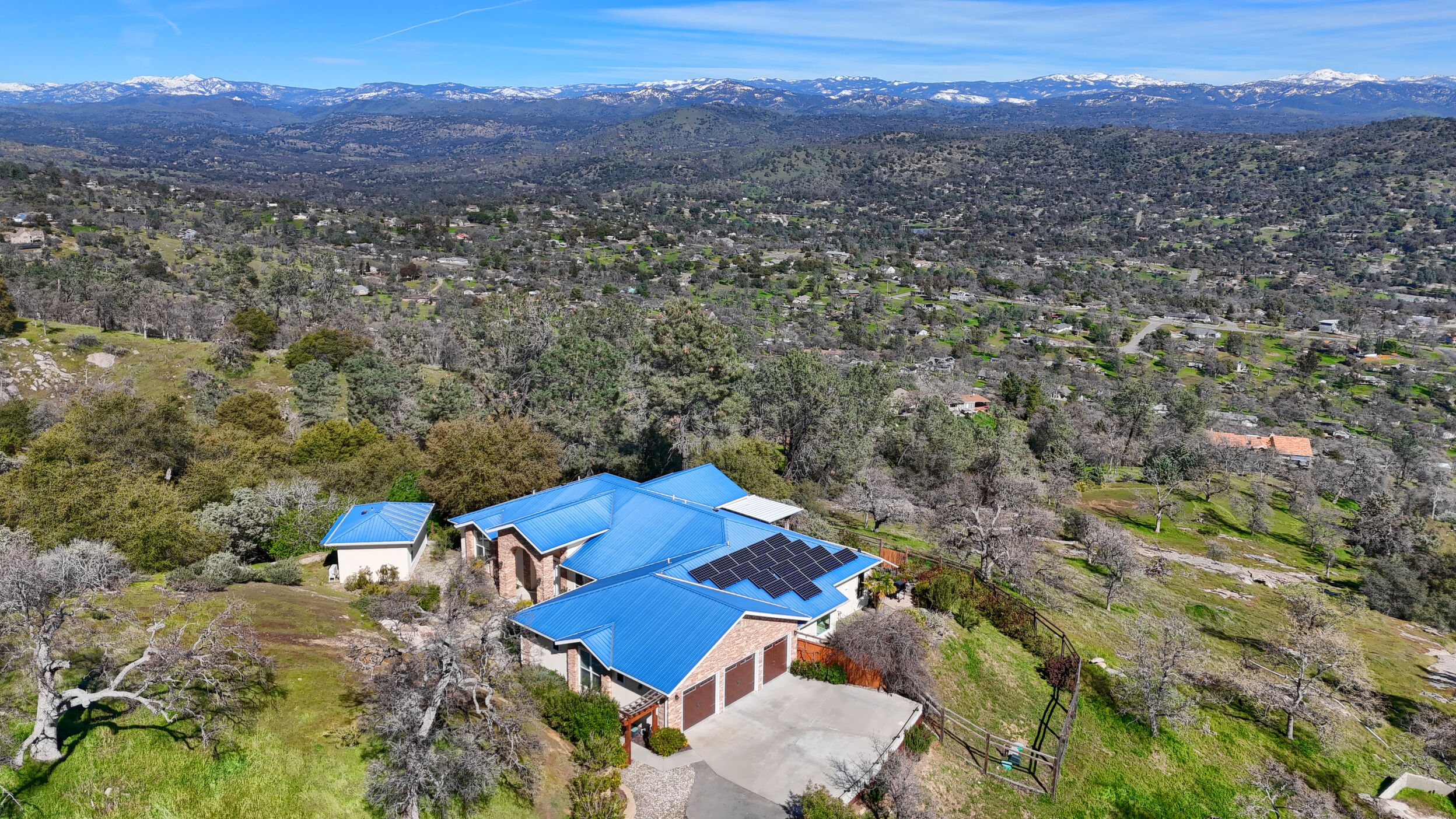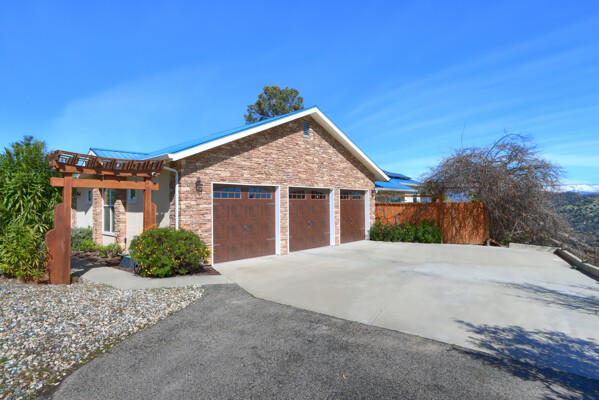 A gently winding private driveway approximately one-tenth of a mile from the main road leads to the home, enhancing privacy and creating a quiet, secluded setting. Notable features include metal roof, fire-resistant siding, fire sprinklers, fire-rated windows, and owned solar. Additional amenities include a private gated entry, three-car garage with separate workshop waterfall fountain at the entry, and low-maintenance natural landscaping with drip irrigation. Property is ideally situated above the fog and below the snow, offering privacy, scenic beauty, and comfortable year-round living.