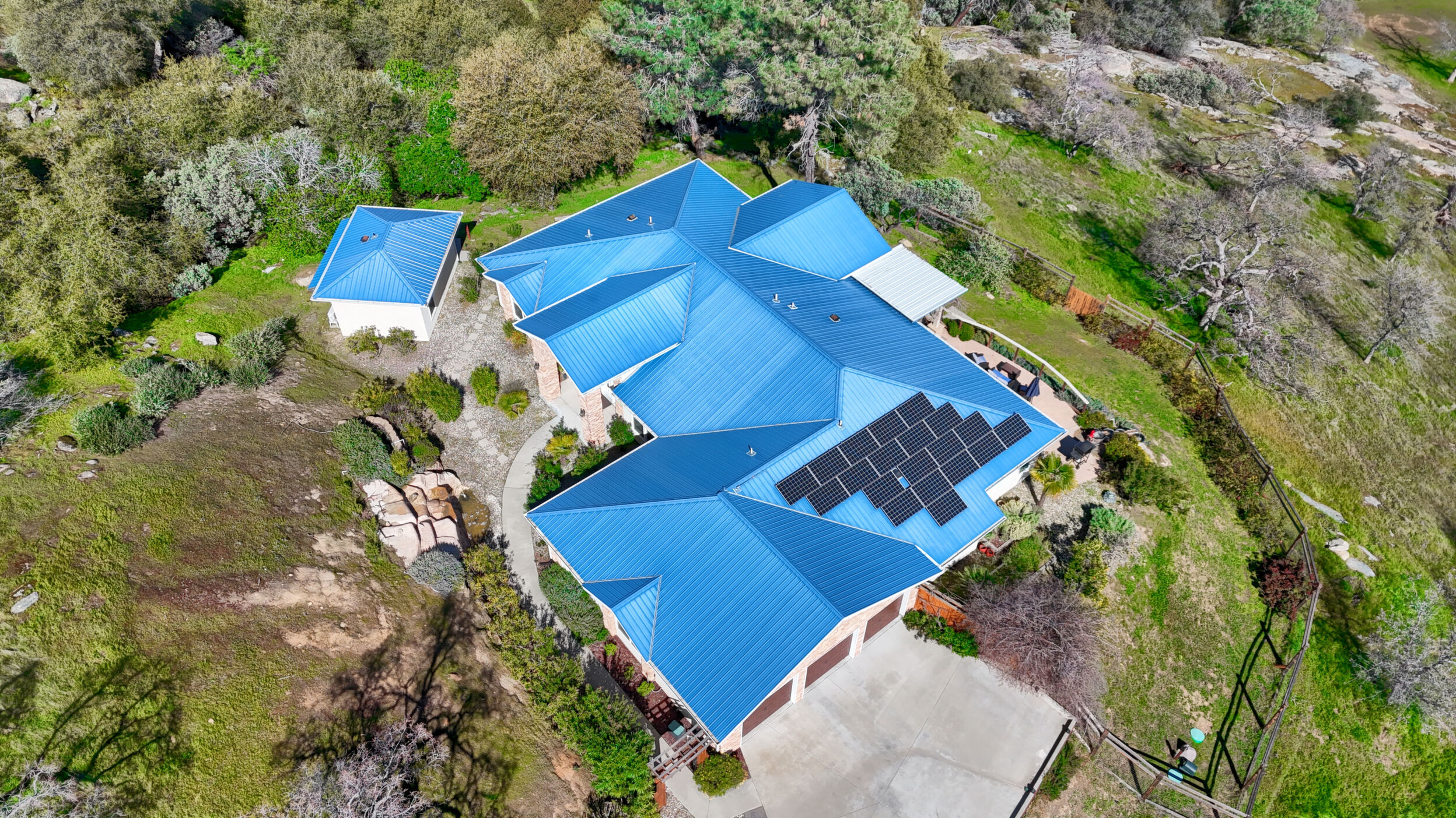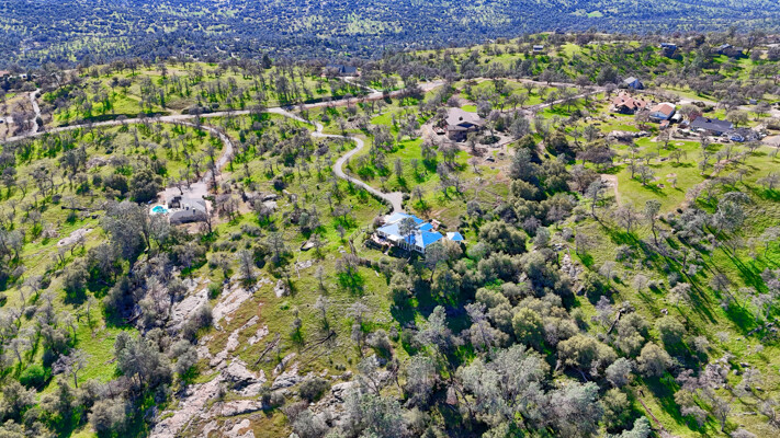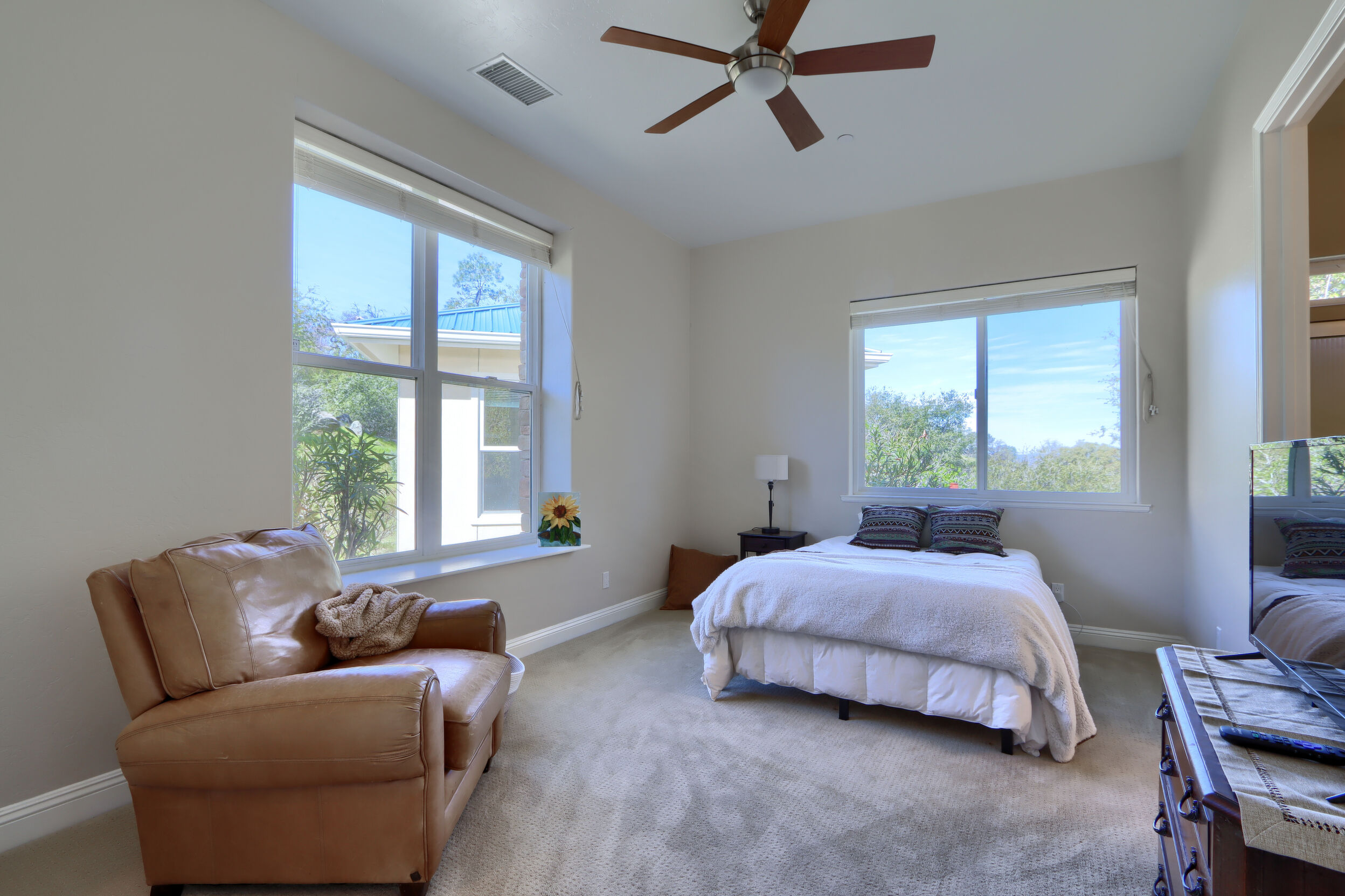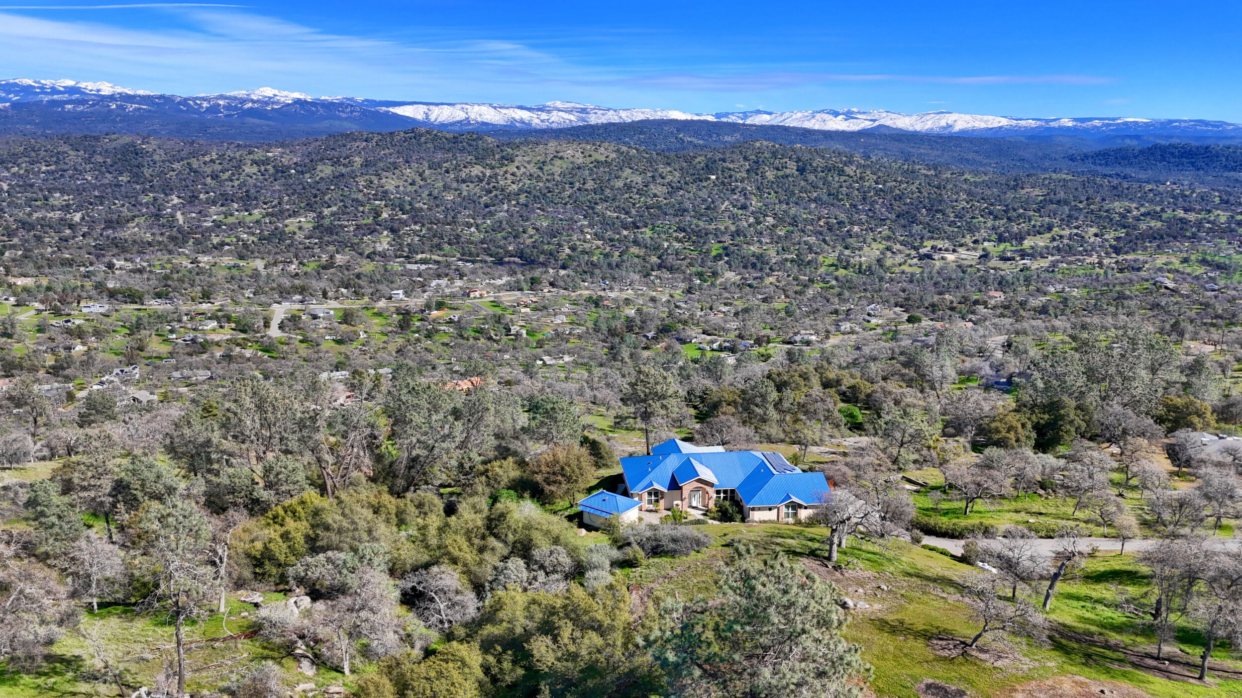 A gently winding private driveway approximately one-tenth of a mile from the main road leads to the home, enhancing privacy and creating a quiet, secluded setting. Notable features include metal roof, fire-resistant siding, fire sprinklers, fire-rated windows, and owned solar. Additional amenities include a private gated entry, three-car garage with separate workshop waterfall fountain at the entry, and low-maintenance natural landscaping with drip irrigation. Property is ideally situated above the fog and below the snow, offering privacy, scenic beauty, and comfortable year-round living.