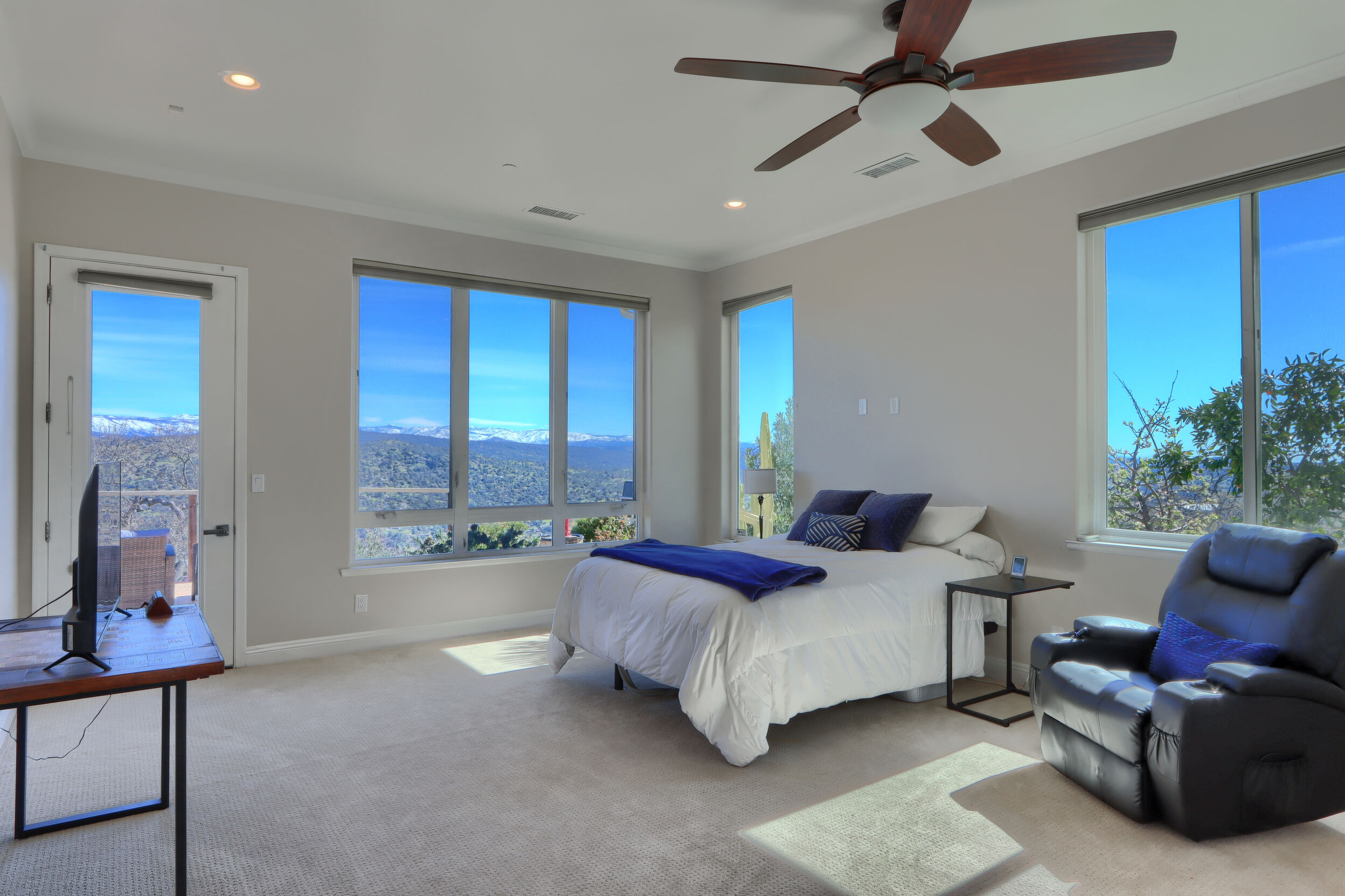 Single-story custom home on over 5 private acres offering panoramic, unobstructed 180-degree mountain and sunrise views. Built in 2015, this 3,986 sq ft residence features 5 bedrooms and 4 bathrooms, including a separate furnished guest house with bath (included in count), along with two large, dedicated office spaces ideal for remote work or multi-generational living.