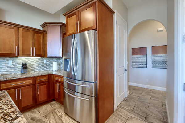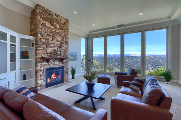 The home is filled with expansive windows in every room, bringing in abundant natural light and capturing scenic views throughout. The main living area showcases dramatic 16-foot floorto-ceiling windows framing the sunounding landscape and an impressive gas fireplace. Spacious eat-in kitchen includes granite countertops, abundant cabinetry, and a large walk-in pantry.