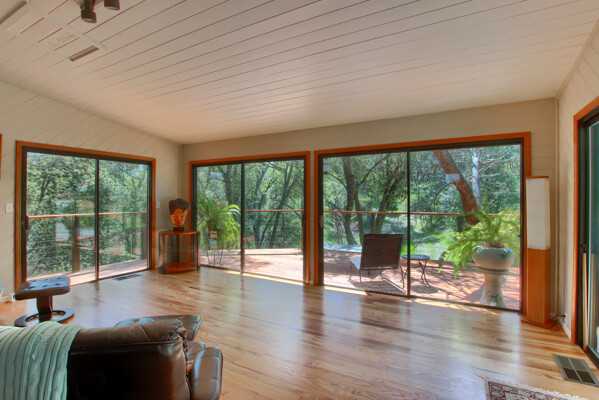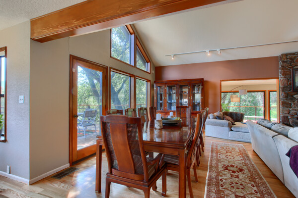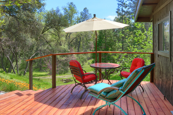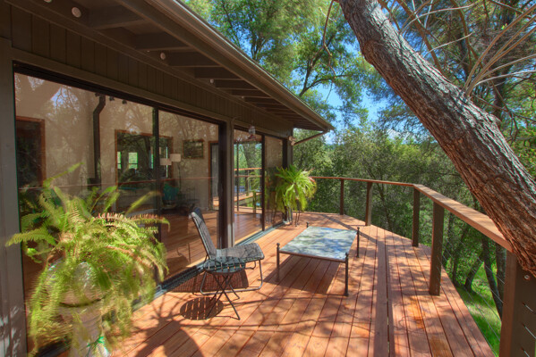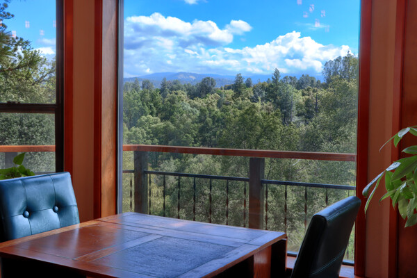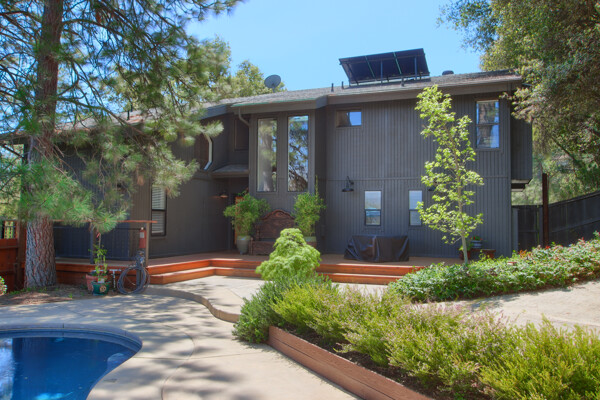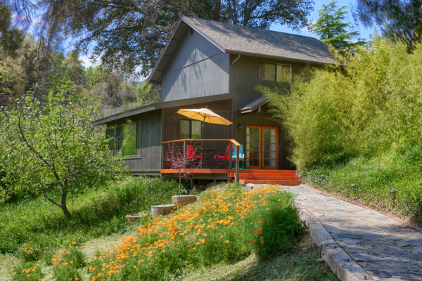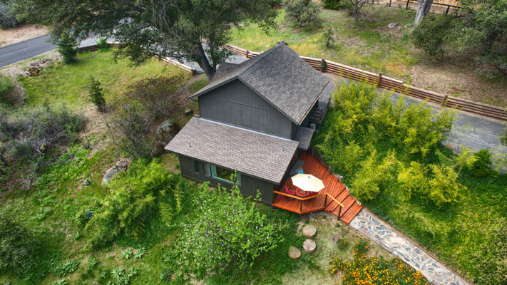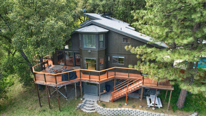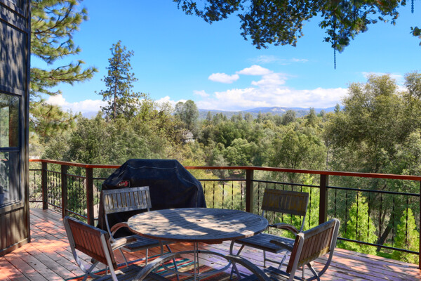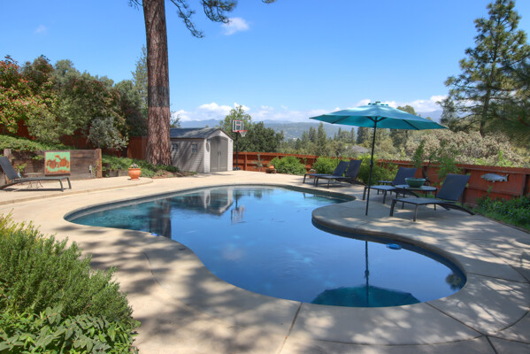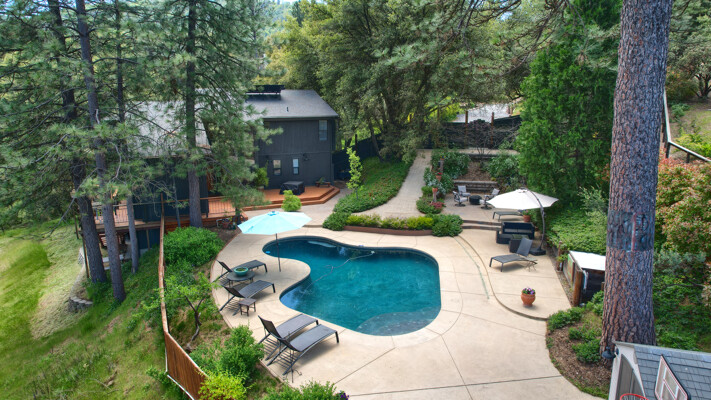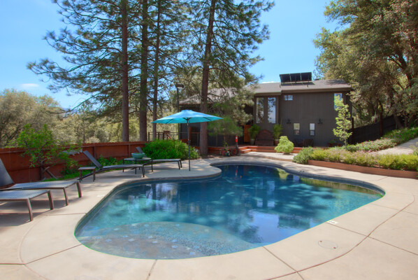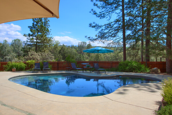 Stunning mountain gem complete with an in-ground pool, creek frontage, gorgeous views and an apartment ADU! The fabulous main home is 2804+/- sq. ft. with 5 bedrooms, 3 bathrooms, beautiful hardwood floors, spacious living/dining room with 2 story ceiling, large kitchen with tile counter tops, built-in bookshelves, recessed lighting, stainless steel appliances and wonderful wood cabinets. There's a great bonus room with wrap around sliding glass doors and a private deck. The primary bedroom is also on the main level with ensuite bathroom. Complete with sit down vanity, walk-in closet and privacy toilet and shower. Guest bedrooms are upstairs and each offers special built-in features. The gorgeous pool is the central focus with dramatic views, charming landscaping and patio areas to accent it. There is a 1 bedroom, 1 bath apartment with a complete kitchen, recessed lighting, french doors and private deck. The homes are built with care to accentuate the beautiful surroundings on this 2.74+/- acres with tall trees, peaceful creek frontage and the serene mountain views! Centrally located close to Oakhurst for shopping, Yosemite National Park for adventure and Bass Lake for fun in the sun. Comes furnished too. Make your appointment to tour this retreat home!