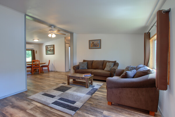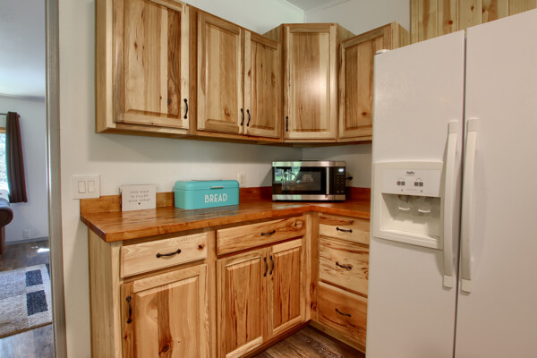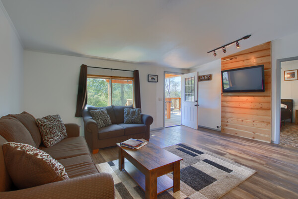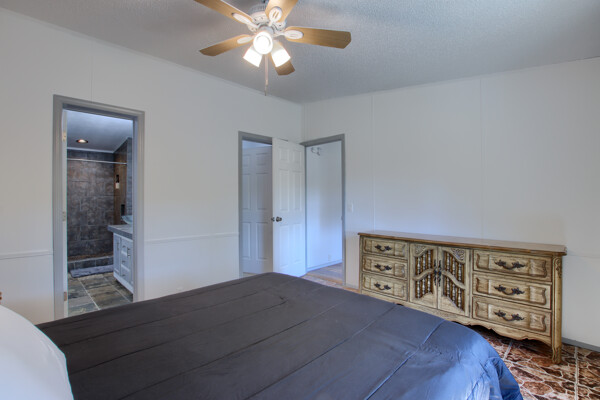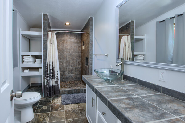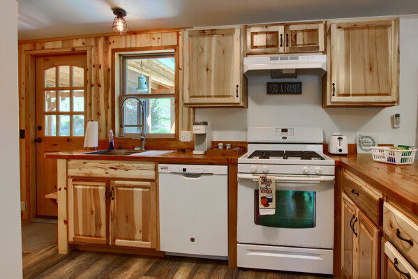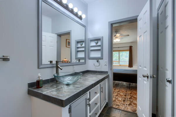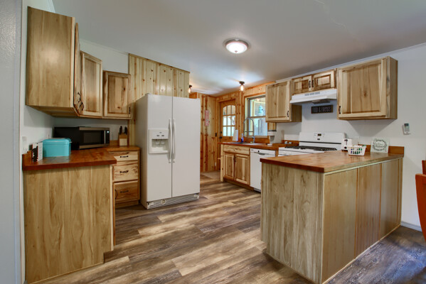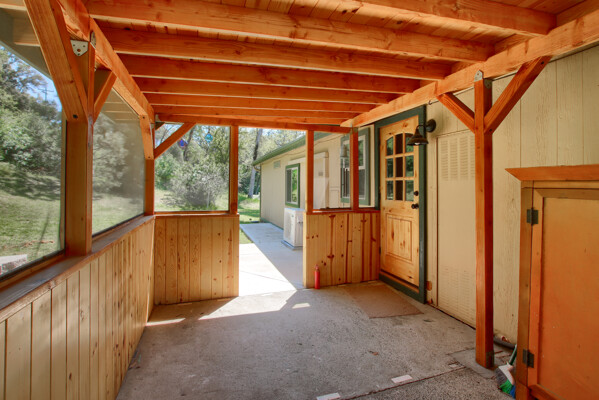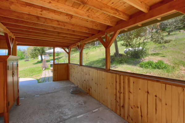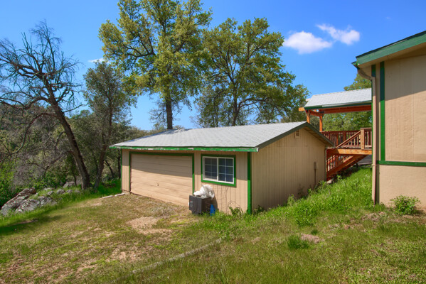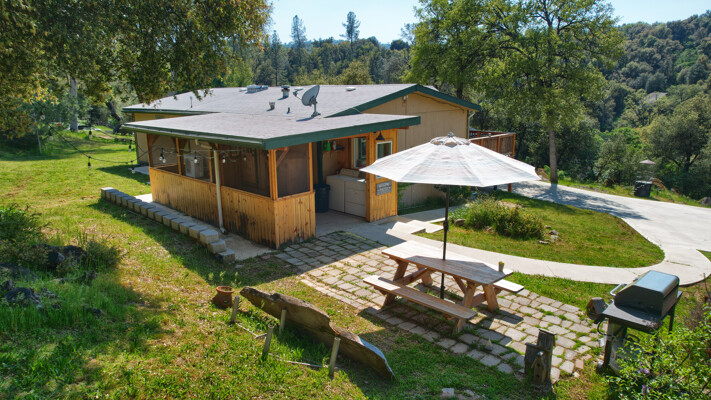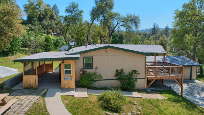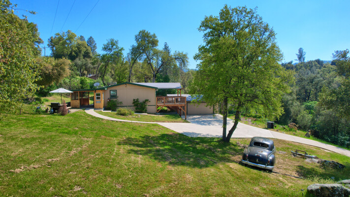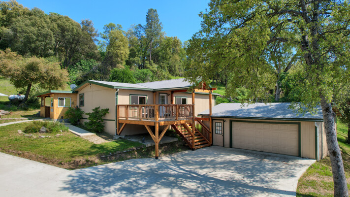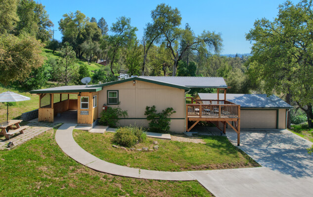 This successful remodeled vacation rental home features 3 bedrooms, 2 baths on almost 2 1/2 beautiful acres! A quiet cul-de-sac and secluded property offer you a peaceful setting to enjoy lovely views from the large deck or the wonderful screened in porch! This 1144+/- sq. ft. manufactured home has been remodeled and upgraded with a fabulous kitchen and bathrooms. The kitchen has Hickory cabinets, large farm-style sink, disposal, butcher block counters and tongue 'n groove pantry with live edge cedar shelf and custom door. The living room has a matching accent wall and a nice sized dining area. The bathrooms have new slate flooring, new guest bathtub and new master tiled shower. Oversized mini splits for AC and heat and Life-proof vinyl flooring throughout (except large guest room and bathrooms). Expansive deck with gorgeous mountain views, tongue 'n groove patio with removable screens, detached drive through garage, concrete parking, 2 driveways with a gate on the top driveway and almost entirely fenced. This is a beautiful property close to Oakhurst for shopping, Bass Lake for water sports and Yosemite National Park for a stunning destination and adventure!
