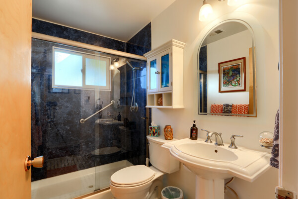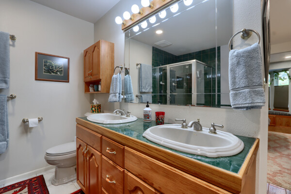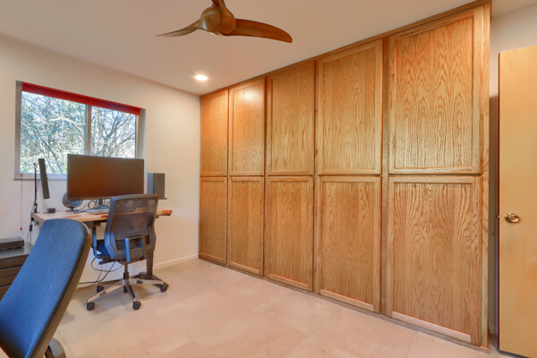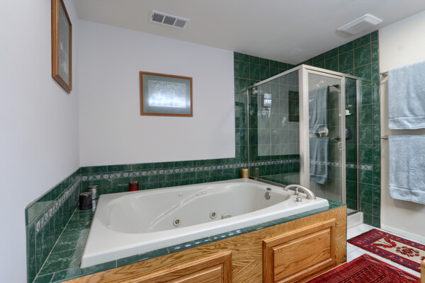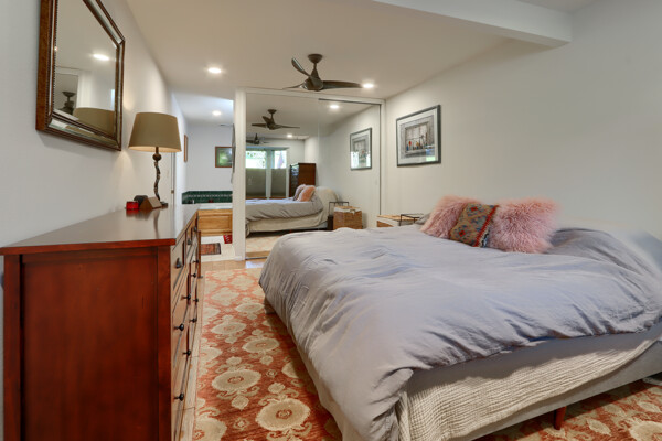 The primary suite offers walk-in closet and lovely garden views. Its en-suite bath includes a jacuzzi tub, double sinks, and a walk-in shower. Two additional bedrooms and a second bathroom are located on the opposite side of the home, providing privacy for family or guests.