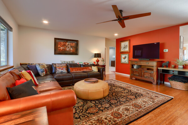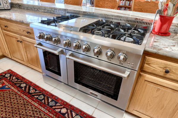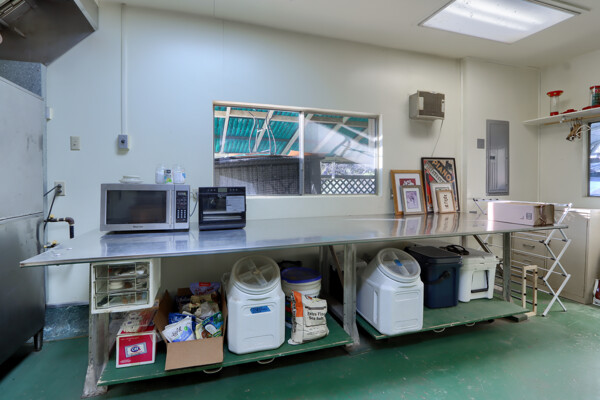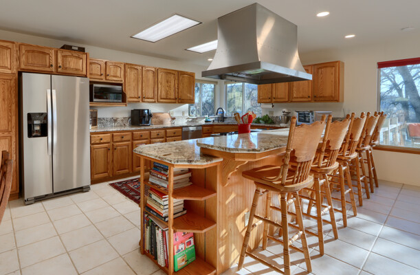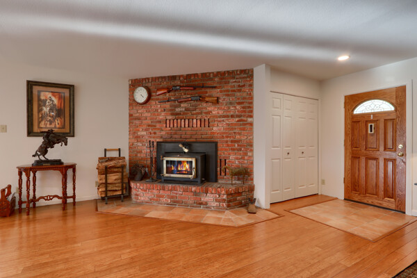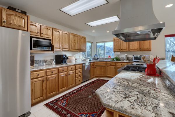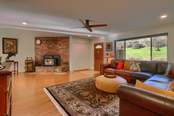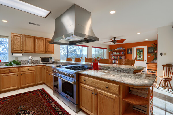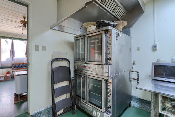 3-bedroom, 2-bathroom home, remodeled in 1995 with further upgrades to lighting, ceiling fans and guest bedroom in 2024, features an open floor plan with a spacious living room and a charming brick fireplace. The large kitchen with granite countertops is designed for serious cooking with a 6-burner cooktop plus griddle, double ovens, and a commercial hood. A separate commercial kitchen, complete with Blodgett double-stacked bakery ovens, stainless steel baking tables, and triple sinks, adds even more possibilities for food preparation or business ventures.